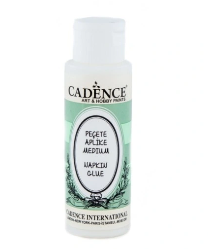 Specjalny klej na bazie wody do serwetek, można go używać na wszystkich powierzchniach, najlepiej o jasnych kolorach. Klej jest koloru białego, po wyschnięciu będzie przeźroczysty. Zabrudzenia czyścimy przy pomocy wody i mydła. Nie toksyczny.