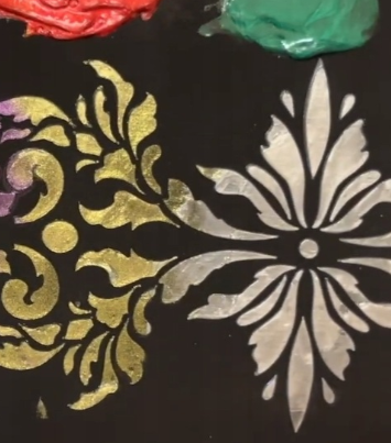 gęsta pasta zawierająca kolorowe metaliczne lub opalizujące pigmenty doskonale nadaje się do tworzenia jasnych, kolorowych, trójwymiarowych dekoracji; opalizujący efekt jest lepiej widoczny na ciemnych powierzchniach